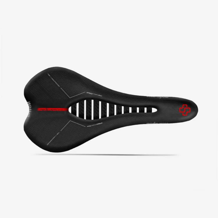 • Konstrukcja zapewnia wentylację i mniejsze ciśnienie dzięki czemu siodło jest lżejsze i bardziej oddychające. Centralny otwór poprawia wentylację i odpowiada za przepływ powietrza podczas jazdy.
