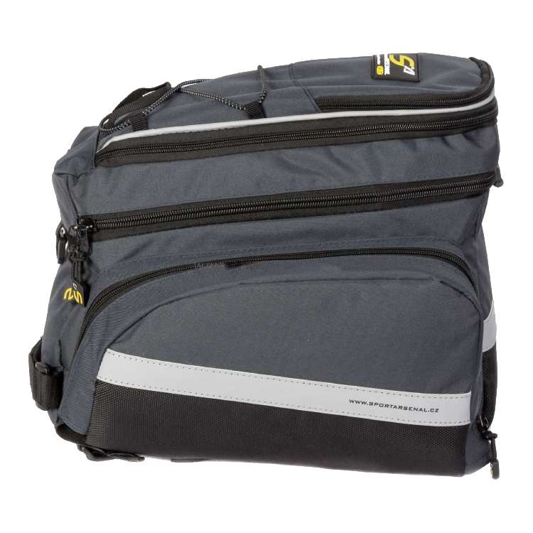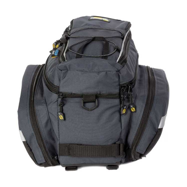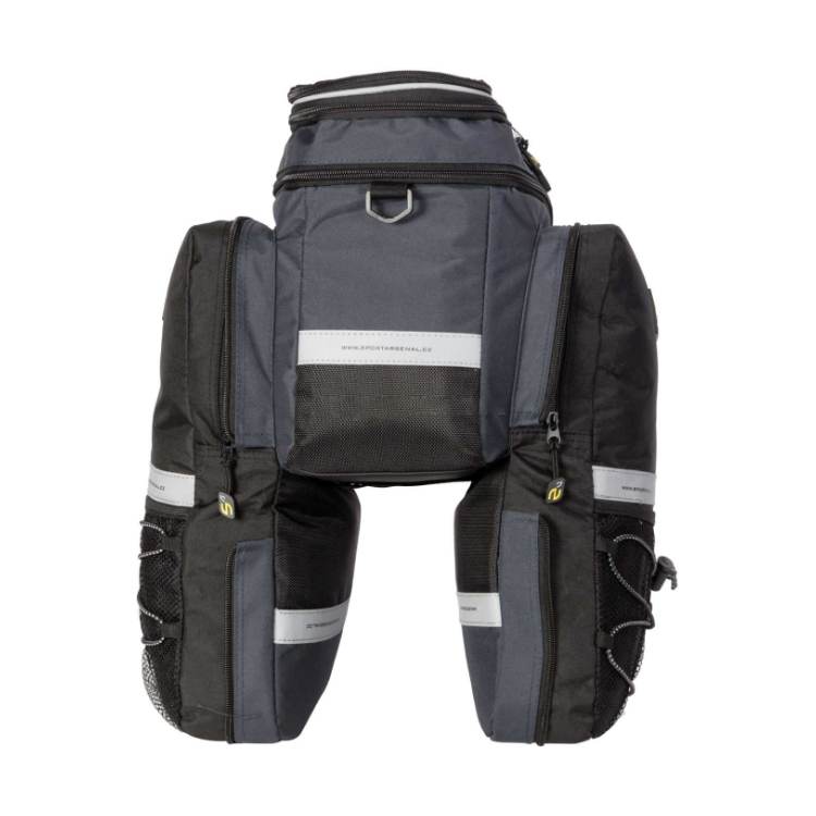 - Dwie duże boczne komory można rozłożyć co pozwali na przekształcenie sakwy jednokomorowej w trzykomorową. Zapinane na zamek. Dodatkowo posiadają gumki ze stoperami do przypięcia dodatkowego bagażu a także duże zewnętrzne kieszenie z siateczki.